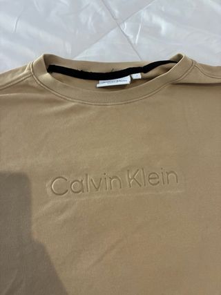 Camiseta de manga corta de Calvin Klein en color beige. Presenta el logo de la marca en relieve en la parte frontal. - Logo de Calvin Klein en relieve.