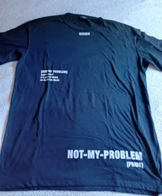 Camiseta de manga corta, de chico,negra con estampado Weird y Not My Problem. - Diseño moderno y llamativo. - Estampado blanco. - Talla XL, aunque talla más grande - " Bershka " - Sin uso Más ropa y cosas de chic@, niñ@ y bebé, en mi perfil, hago descuentos por lotes 🌸
