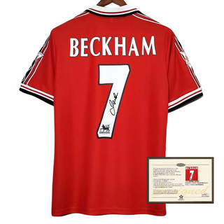 Camiseta de coleccionista con la firma de David Beckham. Un artículo único para aficionados. - Diseño icónico en color rojo. - Talla única, ideal para exhibir. - Incluye certificado de autenticidad (COA).