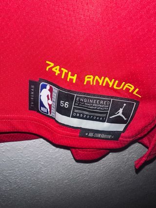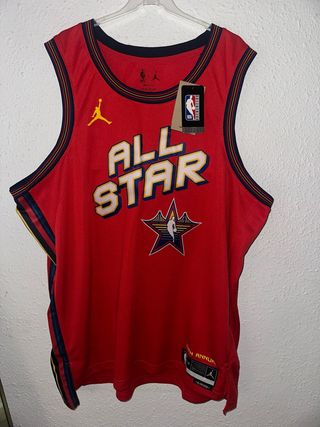 Camiseta de baloncesto Jordan All Star en color rojo. Diseño deportivo con detalles llamativos. - Logo de Jordan en amarillo. - Inscripción ALL STAR en grande. - Detalle del evento All Star en el pecho. - Ribetes en cuello y mangas.