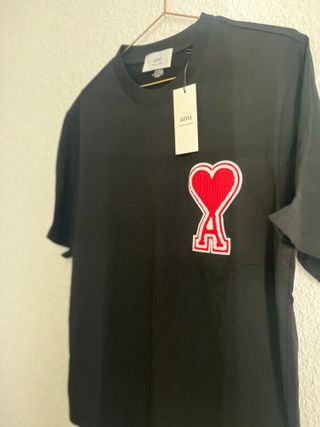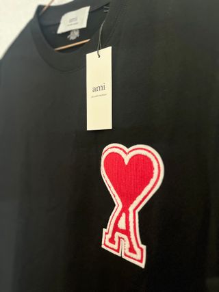 Camiseta negra de Ami Paris con el icónico logo del corazón. - Logo de corazón rojo con borde blanco. - Parche aplicado en la parte delantera.