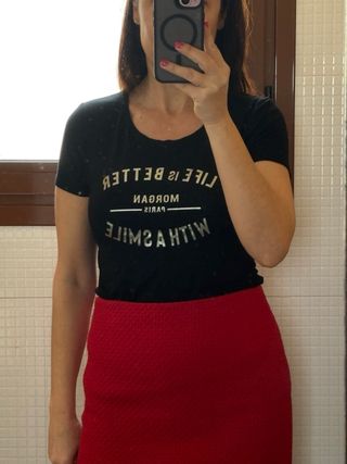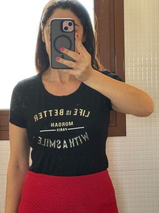 Camiseta negra de la marca Morgan con un diseño estampado. - Estampado frontal con texto. - Cuello redondo. - Manga corta.
