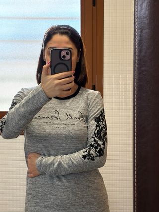 Camiseta de manga larga con un diseño moderno y detalles en las mangas. - Tejido suave y cómodo. - Adorno de encaje negro en las mangas. - Cuello redondo con ribete negro.
