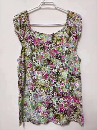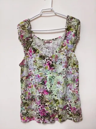 Camiseta de manga corta con un estampado floral vibrante. - Diseño con escote en V. - Mangas cortas con detalle fruncido. - Tejido ligero y cómodo.