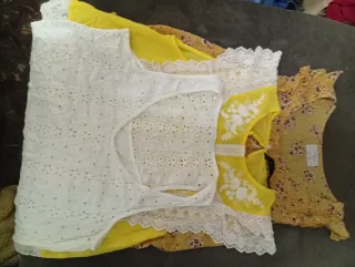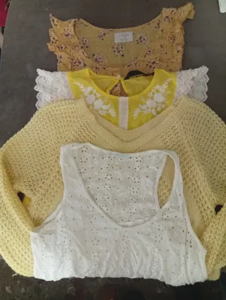 Lote de cuatro camisetas con detalles de puntilla y encaje. Una de ellas es amarilla con estampado floral y volantes en las mangas. Otra es amarilla con bordados blancos en el cuello y encaje en las mangas. La tercera es un jersey amarillo de punto calado. La última es una camiseta blanca de tirantes con bordado de flores. - Camiseta amarilla floral con volantes. - Camiseta amarilla con bordados y encaje. - Jersey amarillo de punto calado. - Camiseta blanca de tirantes bordada. Unidad 2€ Precio TODO6€