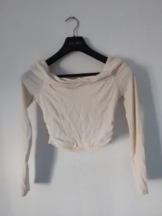 Camiseta de manga larga con un diseño moderno y escote Bardot. - Tejido acanalado. - Corte cropped. - Escote drapeado.