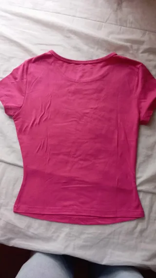 Camiseta de manga corta con un llamativo diseño de corazón en la parte delantera. El corazón está adornado con pedrería brillante. Usada pero Buen estado