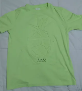 Camiseta de manga corta con un diseño en relieve de una piña con gafas de sol y el texto ALOHA. - Diseño en relieve. - Estampado de piña con gafas. - Texto ALOHA. Talla: 34-36 44-46/S 📏 📦 Envíos rápidos. 📍 Entrega en mano en Alicante.