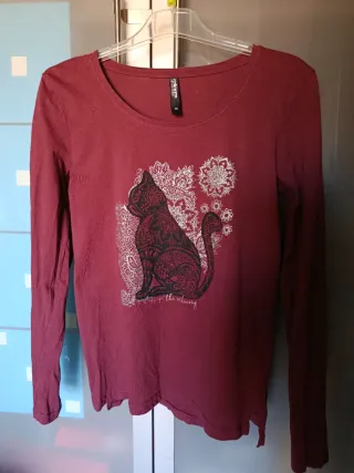 Camiseta de manga larga en color burdeos con un diseño estampado de un gato y motivos florales. - Talla XS, pero talla grande, vale para S. - Diseño detallado del gato con patrones. - Estampado plateado y negro. -Un par de puestas.