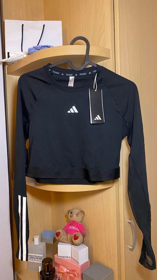 Camiseta larga Adidas de corte crop top. - Diseño deportivo. - Mangas largas. - Logo de Adidas en el pecho. - Detalle de tres rayas en las mangas.