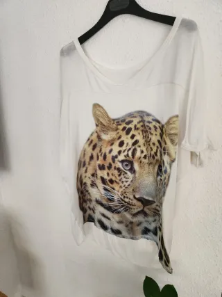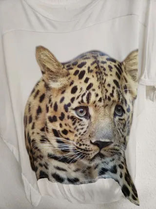 Camiseta con estampado de un leopardo. Diseño frontal de cabeza de leopardo.Tonos tierra y beige en el estampado. Talla/ U Hasta 58 cmde axila a axila