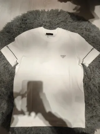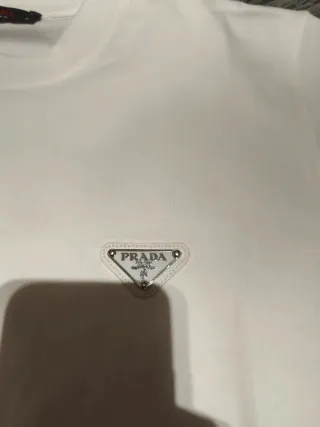 Camiseta de la marca Prada en color blanco. Presenta un diseño moderno y elegante. - Logo de Prada en el pecho. - Detalles de la marca en las mangas.