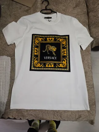 Camiseta blanca con un llamativo estampado frontal. - Diseño con un leopardo en el centro. - Marco ornamental dorado y negro. - Logo de Versace integrado.