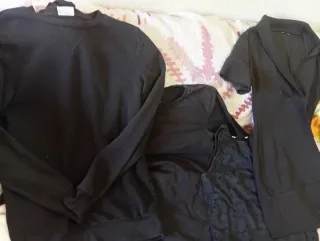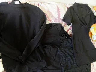 Conjunto de cuatro prendas de vestir en color negro. - una camiseta básica. Manga larga - una sudadera negra manga larga - una camiseta negra con calado. Tirantes grueso - Una vestido tipo minifalda con manga corta ancha y cuello cruzado volteado