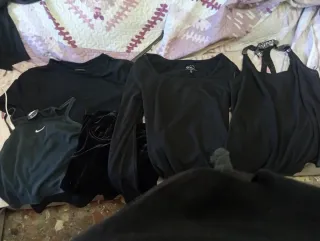 Conjunto de cinco tops y camisetas en color negro, talla M. -top Nike -gasa con espalda tirante de brillantes -negra con escote prominente circular -negra cuello circular -body terciopelo palabra de honor. Lote 5 Tops/Camisetas Negras Talla M - Variedad de estilos. - Diseño liso y con detalles. - Tejidos cómodos.