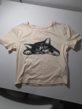 Camiseta de color crema con un adorable diseño de gato durmiendo. - Estampado de gato en blanco y negro. - Cuello redondo y manga corta.