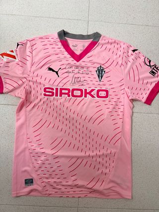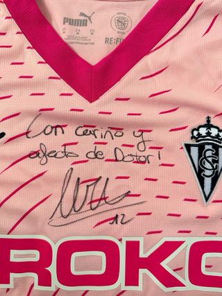 Camiseta de fútbol del Sporting de Gijón con autógrafo. - Diseño con estampado de líneas. - Cuello redondo. - Logo del equipo y patrocinador visibles.