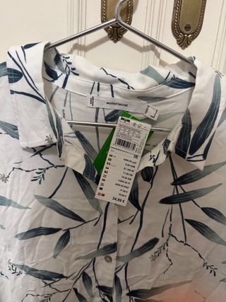 Camisola con un bonito estampado de hojas en tonos verdes y blancos. Es una prenda ligera y fresca. - Diseño de hojas y ramas. - Cuello camisero. - Cierre de botones.