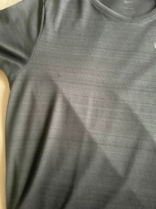 Camiseta deportiva Nike de manga corta, ideal para running. - Talla S. - Tecnología Dri-FIT para una óptima transpiración. - Diseño ligero y cómodo. - Logo de Nike plateado en el pecho.