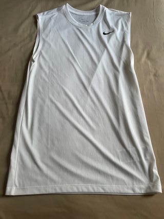 Camiseta deportiva Nike para running, sin mangas y en color blanco. Perfecta para entrenamientos. - Talla S. - Tejido ligero y transpirable. - Logo de Nike en el pecho.