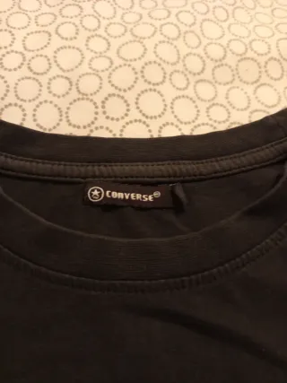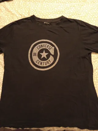 Camiseta gris con un llamativo estampado de zapatillas Converse. - Diseño gráfico de zapatillas altas. - Estampado con detalles de estrellas y rayas. - De axila a axila 47 cm, de largo 62 cm y de hombros 36 cm