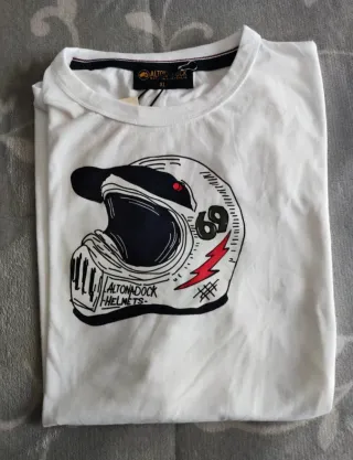Camiseta de manga corta con un diseño gráfico llamativo en la parte delantera. - Estampado de casco de motero con el número 69 y un rayo. - Inscripción ALTONADOCK HELMETS en el diseño.