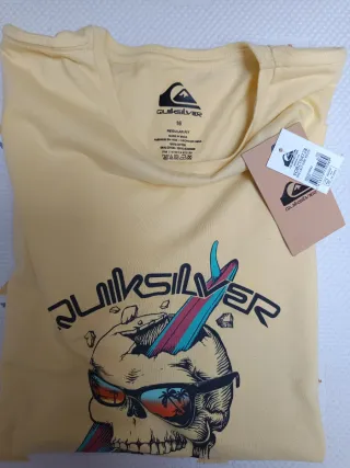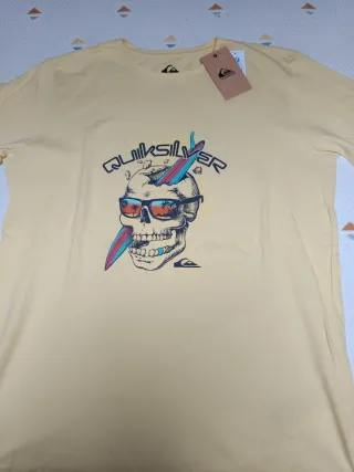 Camiseta de manga corta Quiksilver con un diseño llamativo de calavera y tabla de surf. - Talla 16. - Estampado frontal con calavera, gafas de sol y tabla de surf. - Cuello redondo.