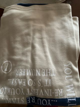 Camiseta con mensaje inspirador. - Diseño con texto A beautiful girl... to be yourself! - Detalle de parche azul con texto Fall or winter go to natural to feel better re-invent yourself - Cuello en V