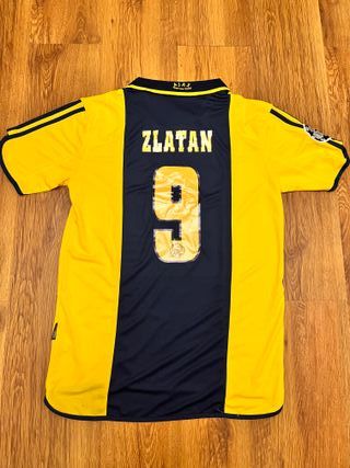 Camiseta de fútbol del Ajax de Ámsterdam de la temporada 2000/2001, con el dorsal de Ibrahimović. - Diseño clásico en amarillo y azul marino. - Logo de Adidas y escudo del Ajax bordados. - Inscripción ABN AMRO en la parte frontal. - Parche de la Champions League en la manga.