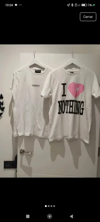 Conjunto de dos camisetas blancas con diseños. - Camiseta con la palabra LOYALTY y logo INSIDE en el cuello. - Camiseta con el diseño I ❤️ NOTHING y un corazón roto rosa.