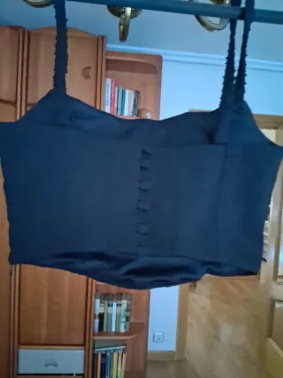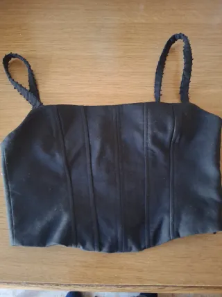 Top negro con un diseño moderno y elegante. Perfecto para combinar con diferentes estilos - Tirantes finos con detalle. - Diseño con costuras verticales. - Corte ajustado. Medidas: De axila a axila 36 ctms Parte de abajo 30 ctms Alto parte delantera 23 ctms Alto parte trasera 13 ctms