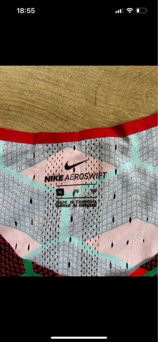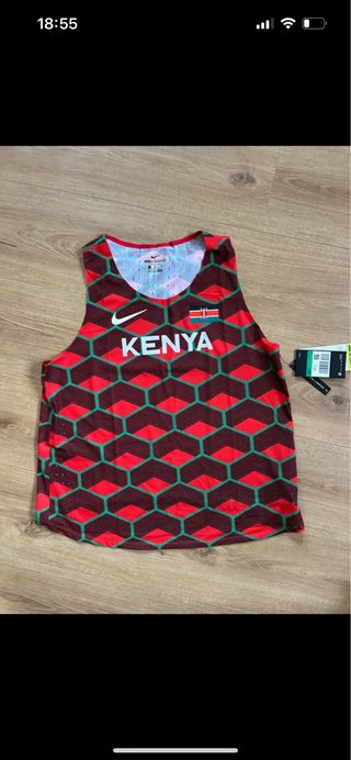 Camiseta de atletismo Nike Aeroswift Elite con diseño inspirado en Kenia. - Patrón geométrico en rojo y verde. - Logo de Nike en blanco. - Bandera de Kenia. - Tejido ligero y transpirable.