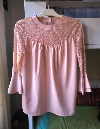 Elegante blusa rosa con detalles de encaje. - Mangas largas con puños acampanados. - Cuello redondo con detalle de encaje. - Diseño con fruncido en el pecho.