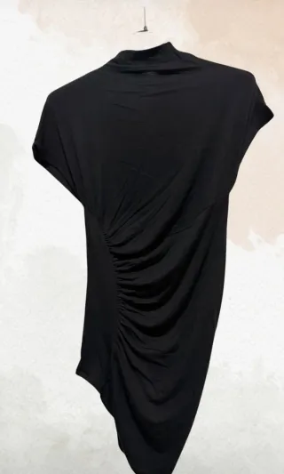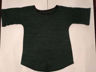 Camiseta de manga corta con un diseño moderno y detalles únicos. - Talla única, adjunto medidas. - 95% acrílico 5% elastano - Bajo asimétrico. - Cuello con tachuelas decorativas. - El tejido tiene un hilo plateado que hace un efecto brillo discreto.