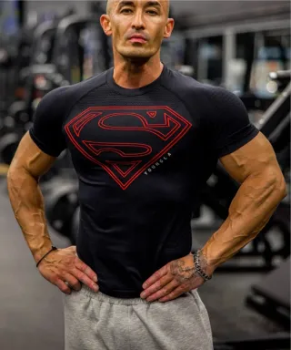 Camiseta deportiva con diseño inspirado en Superman. - Diseño con el logo de Superman en rojo. - Tejido transpirable.