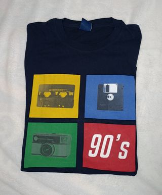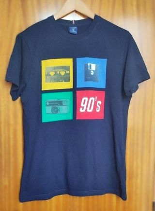 Camiseta Springfield azul marino. Estampado Graphic Tee retro años 90 (Cassette, Disquete, Cámara). 🕹️💾 Corte Regular Fit. 100% Algodón (suave y transpirable). Perfecto estado, colores vivos y sin bolitas. 📏 Medidas: Hombros 43cm | Sisa 53cm | Largo 69cm. ✨ Estado: Muy bueno. 📦 HAGO ENVÍOS. 🛒 ¡Crea tu lote! Si te interesan pantalones cortos (bermudas) o más ropa de mi perfil, dímelo, te hago un anuncio conjunto con descuento para que ahorres en los gastos de envío. ¡Escríbeme! #Springfield #Retro #90s #TallaM #CamisetaHombre #Gamer