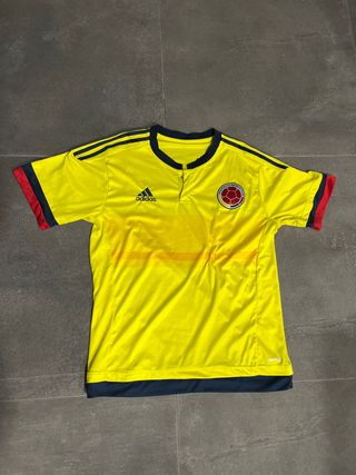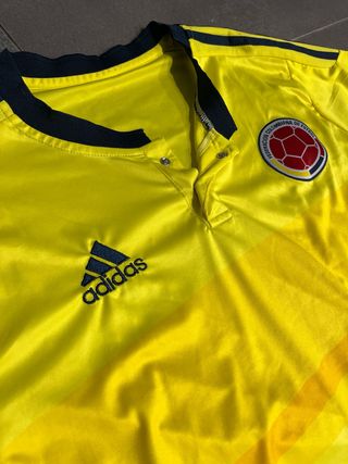 Camiseta de la selección de Colombia de la marca Adidas. - Diseño en color amarillo. - Detalles en azul marino y rojo en mangas y cuello. - Logo de Adidas y escudo de la selección bordados.