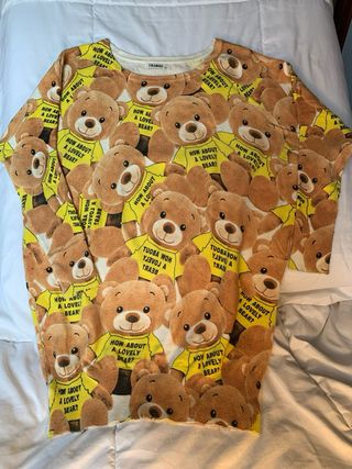 Camiseta con estampado de ositos y mensajes divertidos. - Diseño original Tiramisu. - Estampado de ositos marrones y amarillos. - Mensajes escritos en los carteles de los ositos.