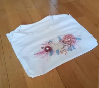 Camiseta blanca delicada y muy femenina, adornada con **apliques florales en relieve** y detalles de perlas 🤍✨. Tejido suave y cómodo, perfecta para un look elegante, romántico y versátil. Talla M, corte favorecedor que se adapta con naturalidad a la silueta. 📸 Se ve tal cual en las fotos, sin filtros ni retoques. 🚚 Envío rápido y seguro en 24–48 h. #CamisetaMujer #TallaM #ApliquesFlorales #EstiloRomántico #ModaFemenina #LookElegante #FotosReales #VintedOfertas