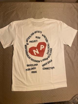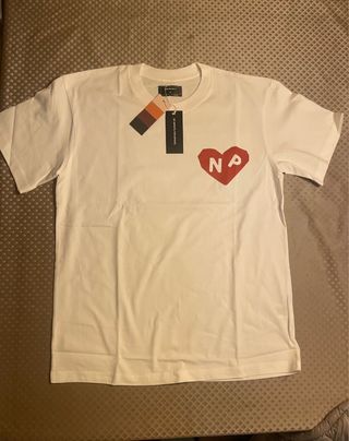 Camiseta blanca con un diseño distintivo en el pecho. - Estampado de corazón rojo con las iniciales 'NP'. - Cuello redondo y manga corta.