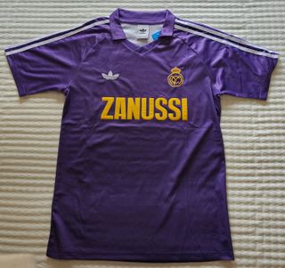 Camiseta oficial del Real Madrid. - Diseño con franjas horizontales en azul claro y beige. - Logo de Adidas en blanco en la manga. - Escudo del Real Madrid en el pecho. - Patrocinador Emirates Fly Better en el frontal.