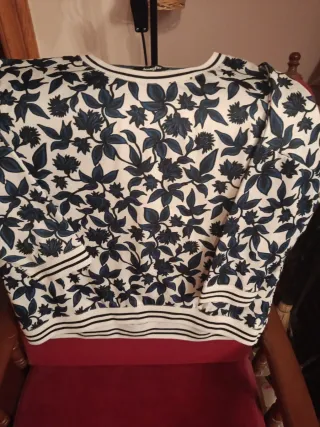 Camiseta con estampado floral en tonos azules y blancos. Presenta un diseño de manga francesa y un acabado con franjas en puños y bajo. - Cuello redondo. - Estampado de hojas y flores. - Puños y bajo con detalle de rayas.