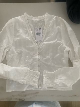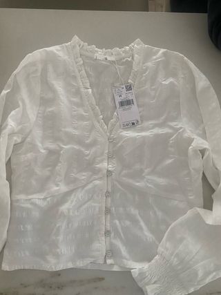 Camisa blanca de Mango Teen, con etiqueta y sin estrenar. Presenta un diseño con cuello volantes y cierre de botones. Es super mona y estilosa pero la talla M equivale a una S ya que es estrechita. - Mangas largas con puños elásticos. - Tejido con textura sutil.
