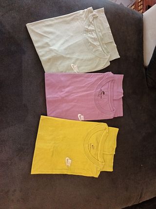 Pack de tres camisetas básicas de la marca Nike. Cada camiseta tiene un color diferente: verde oliva, morado y amarillo. - Camiseta verde oliva con logo Nike. - Camiseta morada con logo Nike. - Camiseta amarilla con logo Nike.