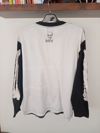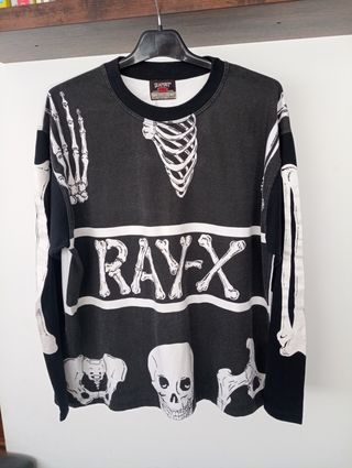 Camiseta de manga larga vintage con estampado de esqueleto completo y texto RAY-X. En perfecto estado. - Firma Seaport Second To None TALLA L aunque parenta una XL . Tejido algodón poliéster, se lava muy bien en la lavadora y no se aruga . Tres colores negro , blanco & gris. - Diseño llamativo con calaveras y huesos. Estilo rock/heavy. - Ideal para eventos temáticos o uso casual 🚛🛣️ Hago envíos , más cositas en mi perfil .