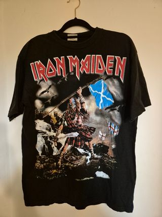 Camiseta 2000's de manga corta con estampado. Vintage - Diseño frontal con temática de Iron Maiden. - Estampado de guerrero escocés con banderas. - Cuello redondo.