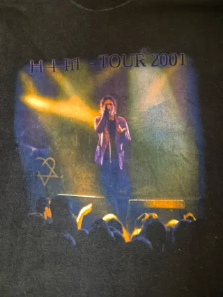 Camiseta Him 2001 Tour comprada en 17/11/01 HIM Barcelona Razzmatazz. Shoulder 49cm Bust 48 cm Lenght 72 cm Vintage 2000's - Diseño frontal con banda y público. - Estampado HIM - TOUR 2001 en la parte superior.