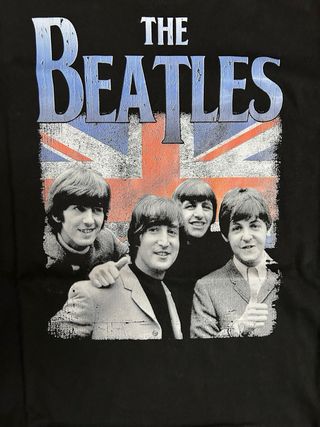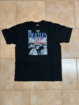 Camiseta negra con estampado de The Beatles y la Union Jack. - Diseño frontal con la banda y la bandera británica. - Estampado multicolor sobre fondo negro.