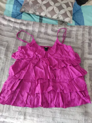 Este top morado es una prenda femenina y con estilo. - Diseño con múltiples volantes. - Tirantes finos. - Tejido ligero y vaporoso.