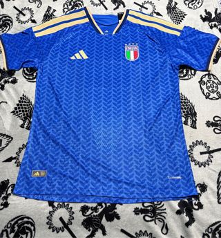 Camiseta de la selección italiana de fútbol. - Diseño con patrón de espigas. - Detalles dorados en cuello y mangas. - Escudo de Italia bordado. - Logo de Adidas en amarillo.